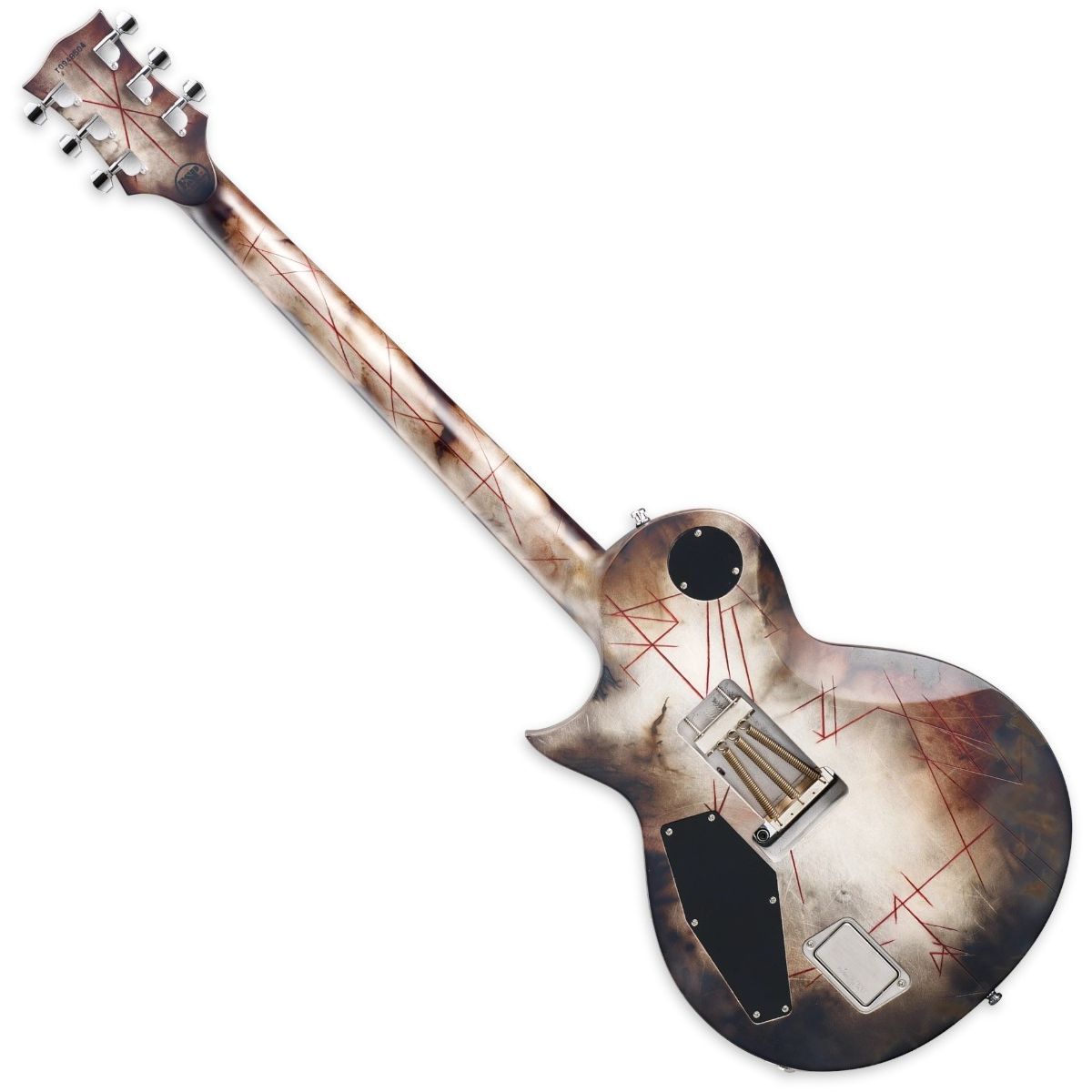 “Distressed” barely begins to describe the treatment given to the RZK-II Burnt. Its body is intentionally gouged and burned, creating the appearance of a guitar that has survived an apocalyptic event and is still ready to dominate the stage. From the matched headstock finish to the mysterious red accents inside the tremolo routing, every detail is purposefully executed by ESP’s artisans.