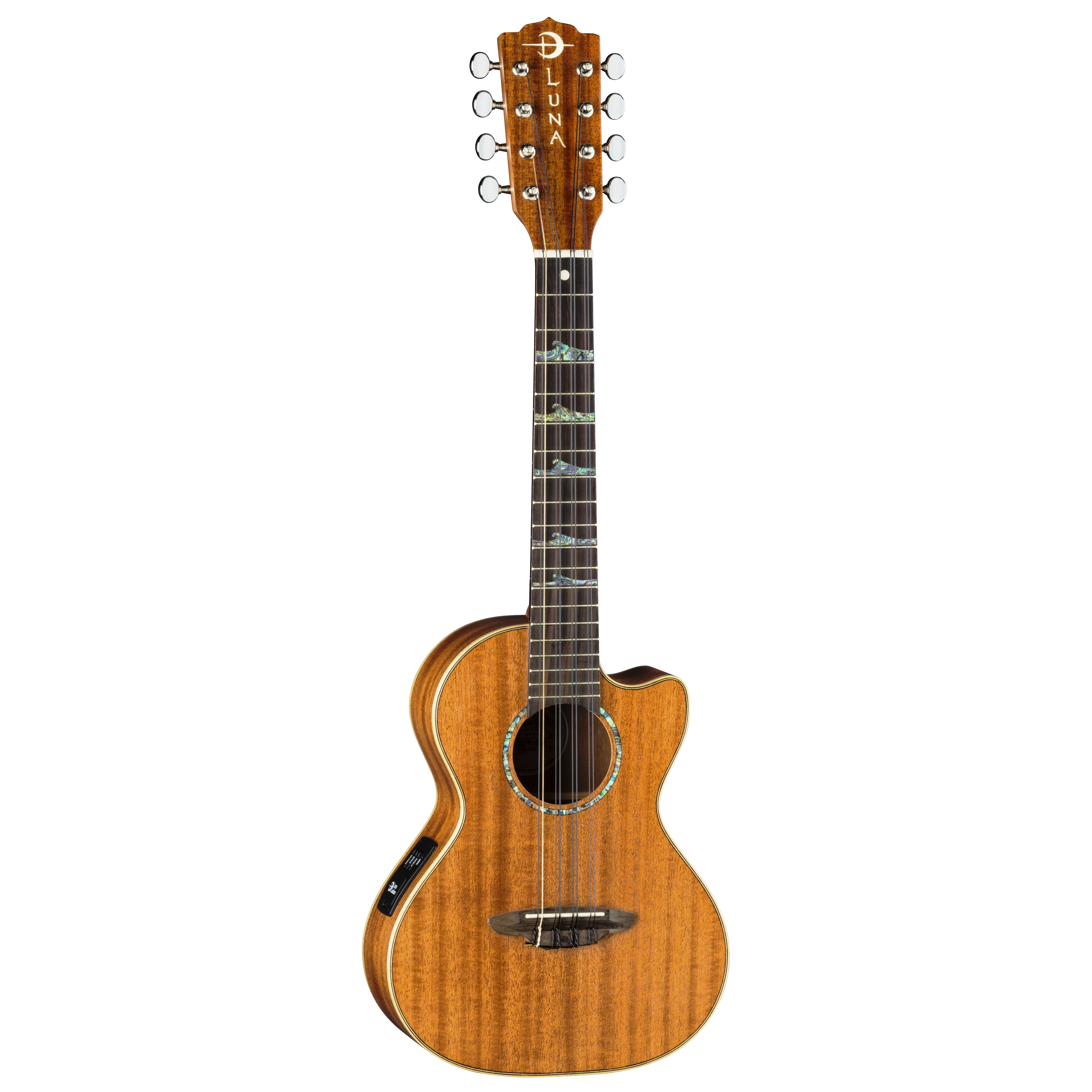 8 string ukuleles have "doubled" strings and are widely used to produce a driving rhythmic sound. The characteristic “chorus” effect results from both octave and unison harmonies that occur from string to string. The "High Tide" Series is Luna's premier line of Ukuleles. This beautiful series of Ukes takes it's inspiration from the full moon at the first fret which causes the abalone wave fret markers below it to "rise" as they make their way up the fretboard towards the moon's pull. High-Tide ukes are crafted from exotic tropical hardwoods and soundhole framed by an abalone ring. This beautiful Luna ukulele features a set neck and all Mahogany construction, resulting in full, deep sound along with the instrument's tenor body size. The cutaway offers comfort when accessing the upper-register frets, and the mahogany neck and walnut bridge and fretboard add lasting sustain and clarity to your tone. The open-style tuners keep the instrument in precise tuning while the onboard preamp provides easy amplification that can be dialed in quickly. Dressed in a satin finish, this is a great addition for the accomplished player.