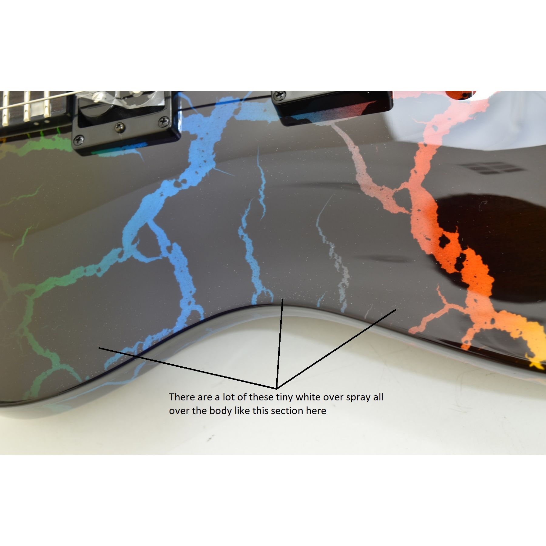 This B stock LTD Eclipse 87 NT guitar is in excellent shape! There are a lot of tiny white over-sprayed paint dots all over the body, please see the close-up picture for detail of a section of the guitar. Awesome buy on a great guitar!