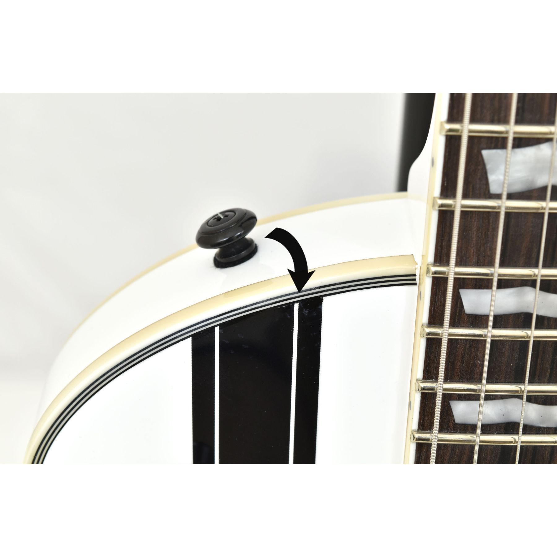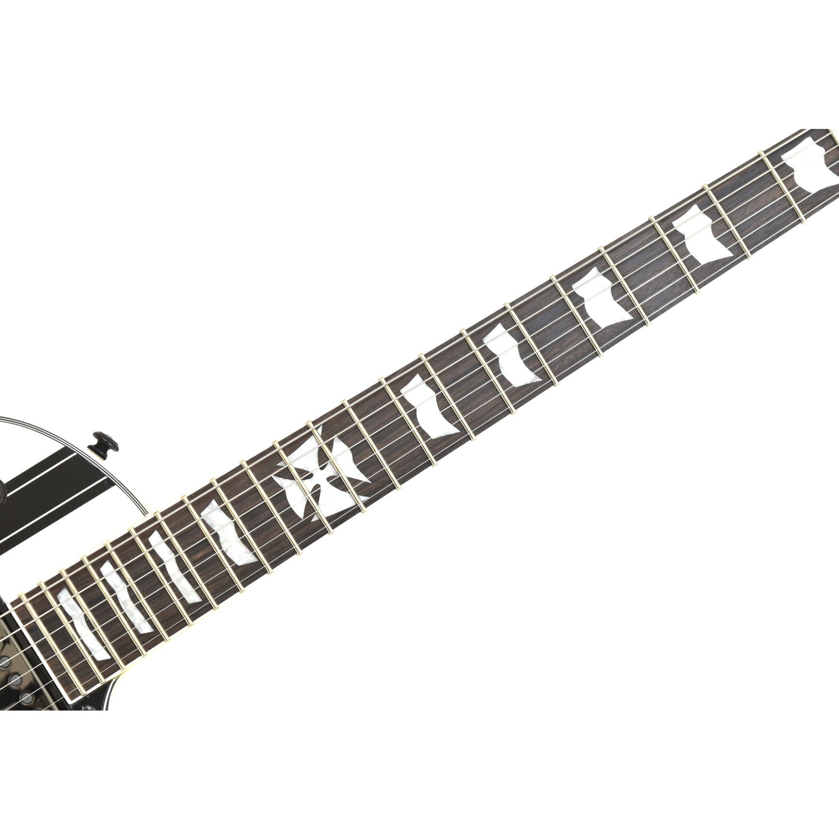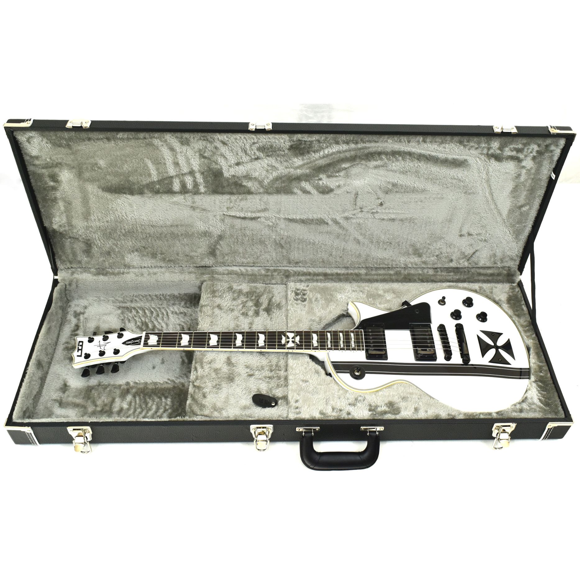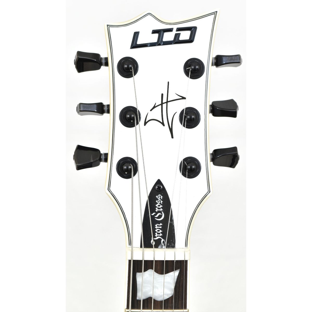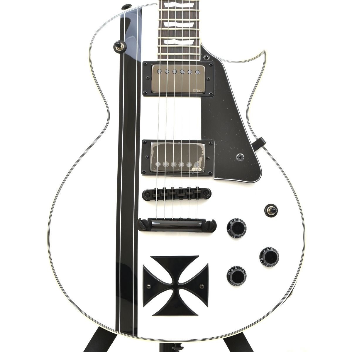 The LTD Iron Cross is a Signature Series model of James Hetfield, the frontman of Metallica and one of the world's most highly respected rhythm guitar players in any genre. The Iron Cross is based on James' personal custom instrument design, and features set-neck construction of a mahogany body with maple cap, and a three-piece mahogany neck with ebony fingerboard and 22 extra-jumbo frets with an Iron Cross inlay at the 12th fret. The LTD Iron Cross is powered by James' own EMG JH SET active pickups, and includes a TonePros locking TOM bridge and tailpiece. Available in Snow White finish with black stripe graphic and iron cross fixture.