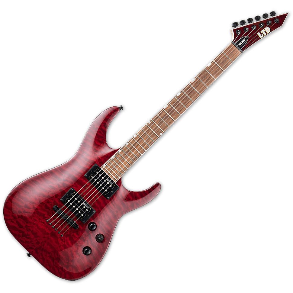 The MH-200QMNT offers the arched top of the ESP Horizon with the aggressive styling elements of the M Series, all wrapped in an affordable high-quality instrument, and adds a quilted maple top in See Thru Black Cherry finish. It features bolt-on construction of a mahogany body with a maple neck and roasted jatoba fingerboard with 24 extra-jumbo frets. Its sound is powered by powerful, punchy ESP Designed pickups, and it has a TOM bridge with string-thru-body design.