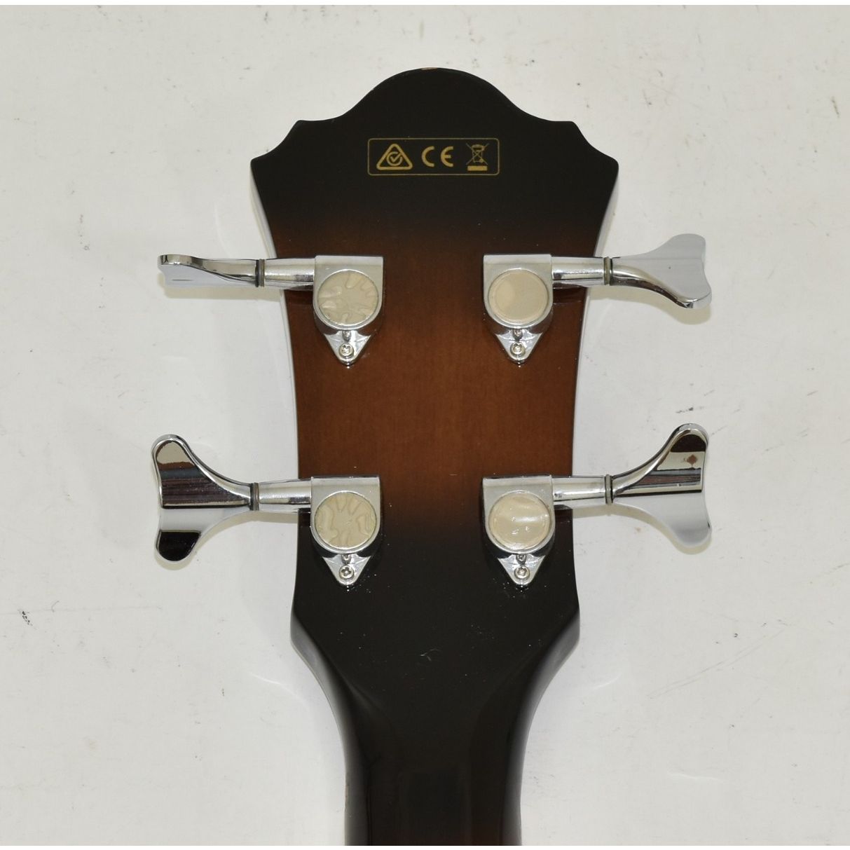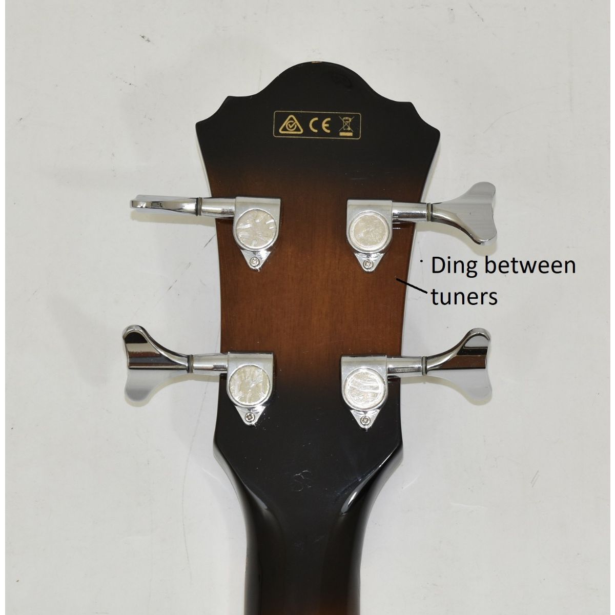 Ibanez AEB10E-DVS Artwood Series Acoustic Electric Bass in Dark Violin Sunburst High Gloss Finish B-Stock* acoustic electric bass with a ding /crack on the side of the headstock between the tuners. There is also a white mark on the back top of the body. See images for detail. Great guitar, ready to play.