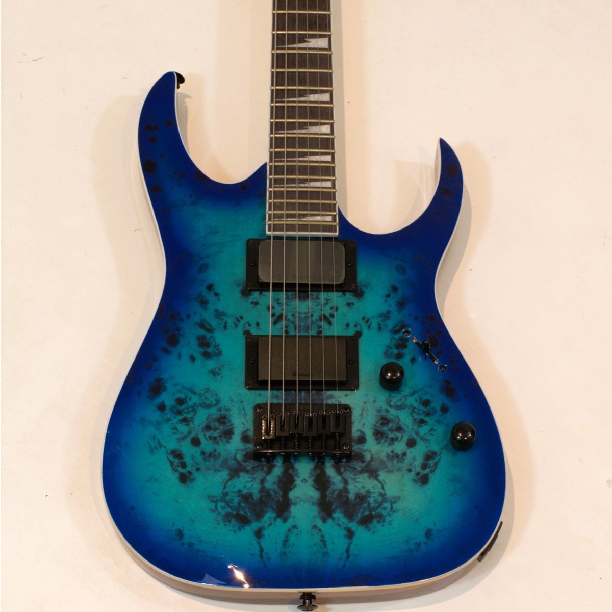 The Ibanez GRGR221PA offers classic RG styling with beginner-to-intermediate-friendly playability and aggressive tone. Its fast maple neck, 24-fret access, and IBZ-6 humbuckers make it a dependable rock and metal guitar, while the Aqua Burst Poplar Burl Art Grain top delivers standout visual appeal at an excellent value—especially as B-Stock.
