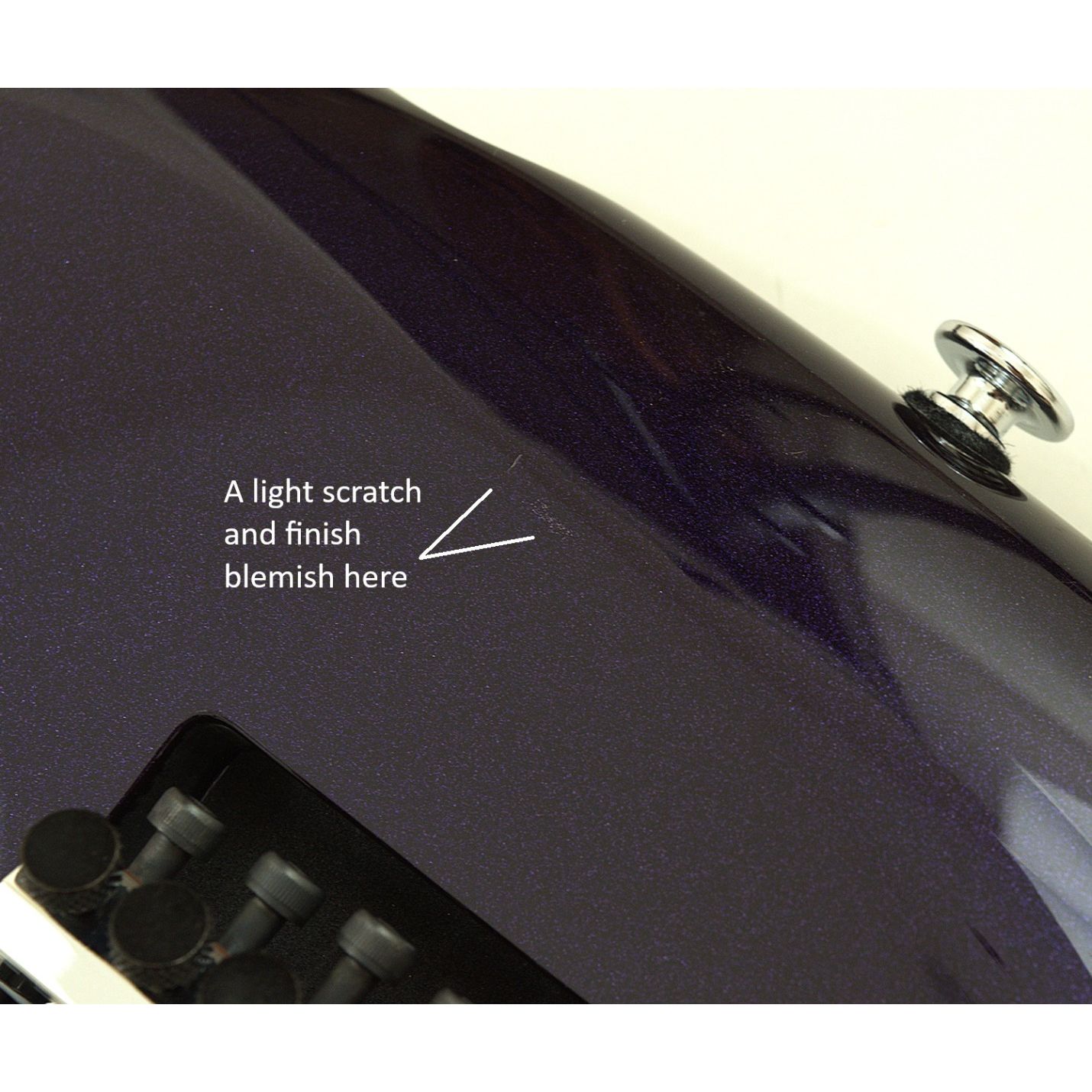 This is a B-Stock guitar with a minor cosmetic blemish behind the bridge. It is fully functional and professionally inspected. A hard case is included for secure transport and storage.