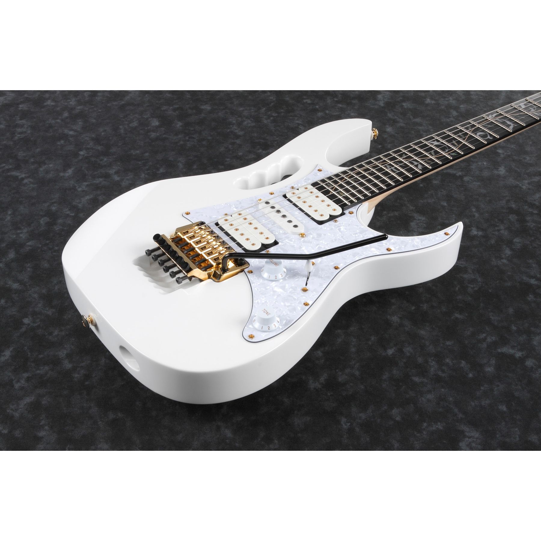 The JEM7VP starts with an Alder body featuring its clear tone, and covered in high-gloss pure White with gold hardware. The Wizard 5pc Maple/Walnut neck w/KTS™ TITANIUM rods includes Jumbo frets finished with the Premium Fret Edge Treatment for smooth, comfortable performance.