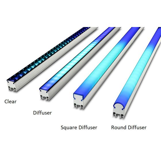 All Exterior PixLines are available with 4 different diffusers allowing for selecting the right look for the right application: Flat clear front, Flat diffused front, Square diffused front and Round diffused front.