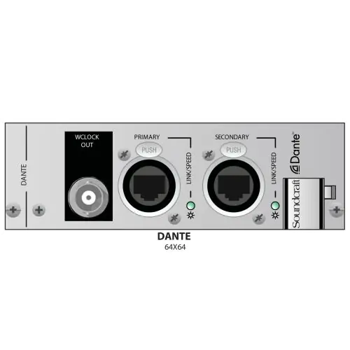 The Dante card allows 64 channels tobesentto/ received from a Dante network. As well as providing audio exchange with other Dante-enabled equipment,the card also allows 64 channels of audio to be connected directly to a PC or Mac computer for recording or processing,by using a standard Ethernet connection.