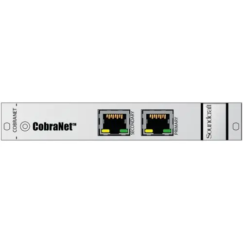 The CobraNet card allows up to 32 channels of input or output signals (or a combination of both) to be received by or sent from console onto a CobraNetTM network. The card must be used as the Conductor for the network. By default,the card is configured for 32 outputs.
